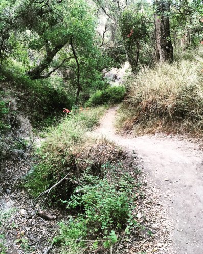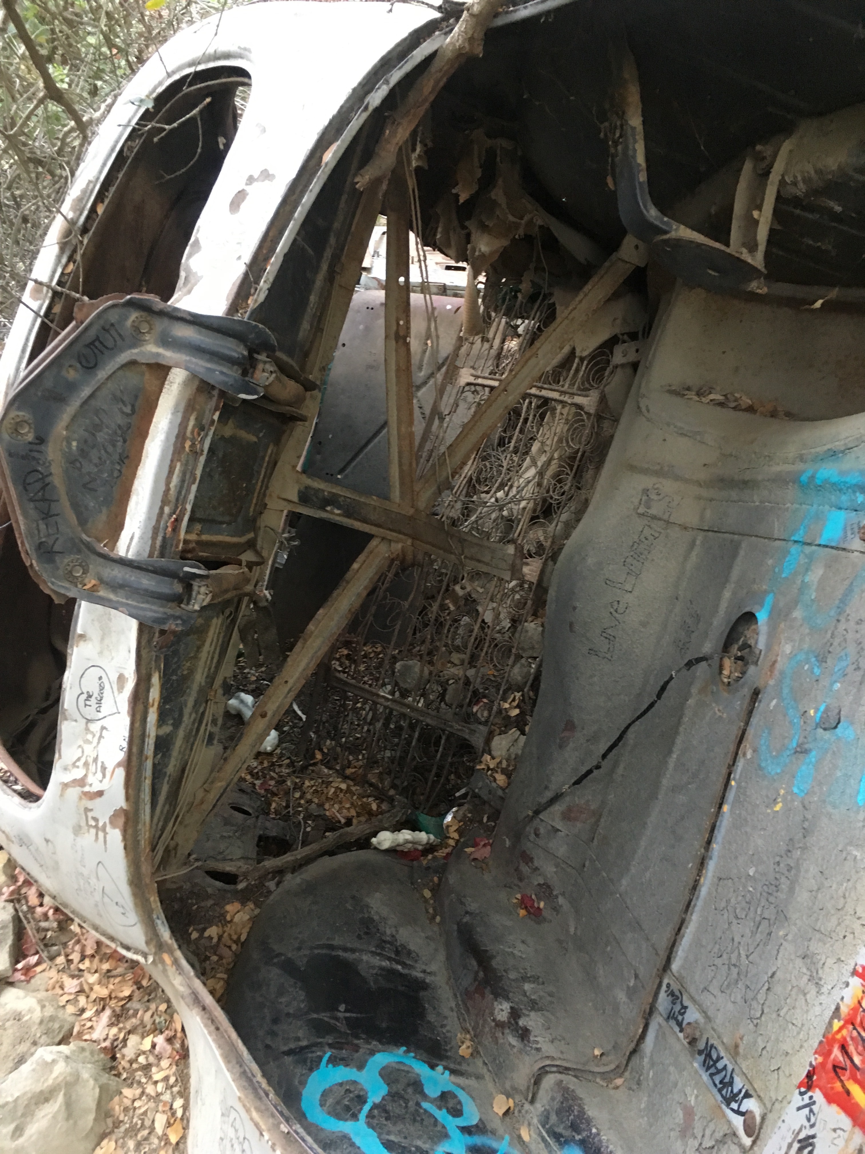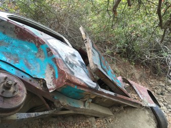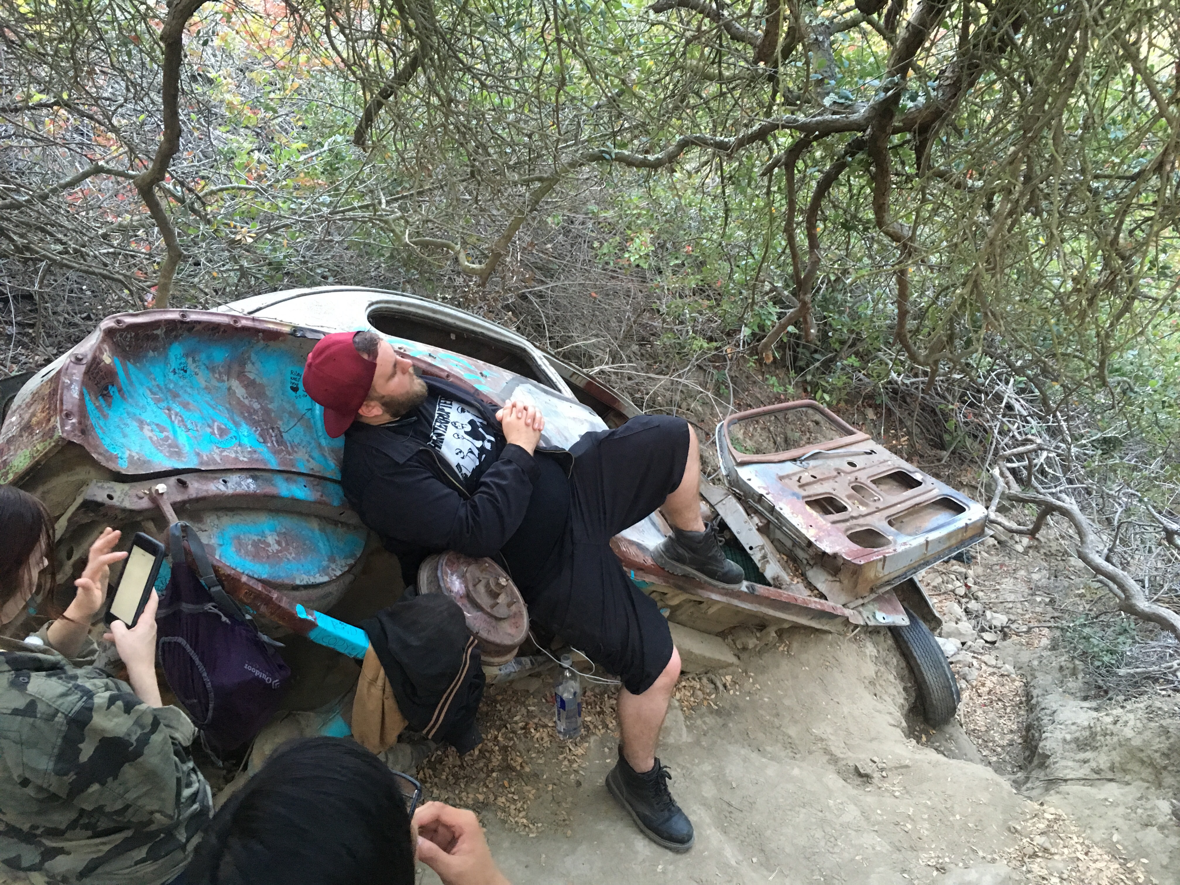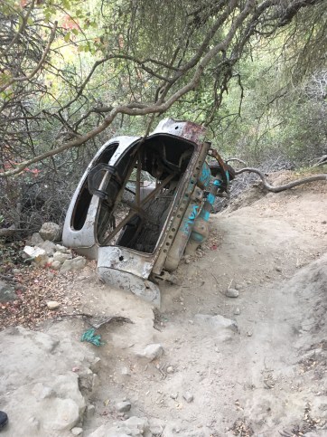 Last week, we went hiking with some friends that don’t usually go hiking! We went to Car Wreck Trail In Aliso Viejo Canyon. We started at the Top of the World in Laguna Beach and went down from there. I haven’t been able to find a reason why the car is there, or who crashed it, but it is definitely bizarre to see a car wreck in the middle of a dense forest-y area! Someone has spray painted the car blue, and it is littered with sharpied graffiti, a lot of it seemingly done by someone named Riley…who apparently loves Kim. A lot.