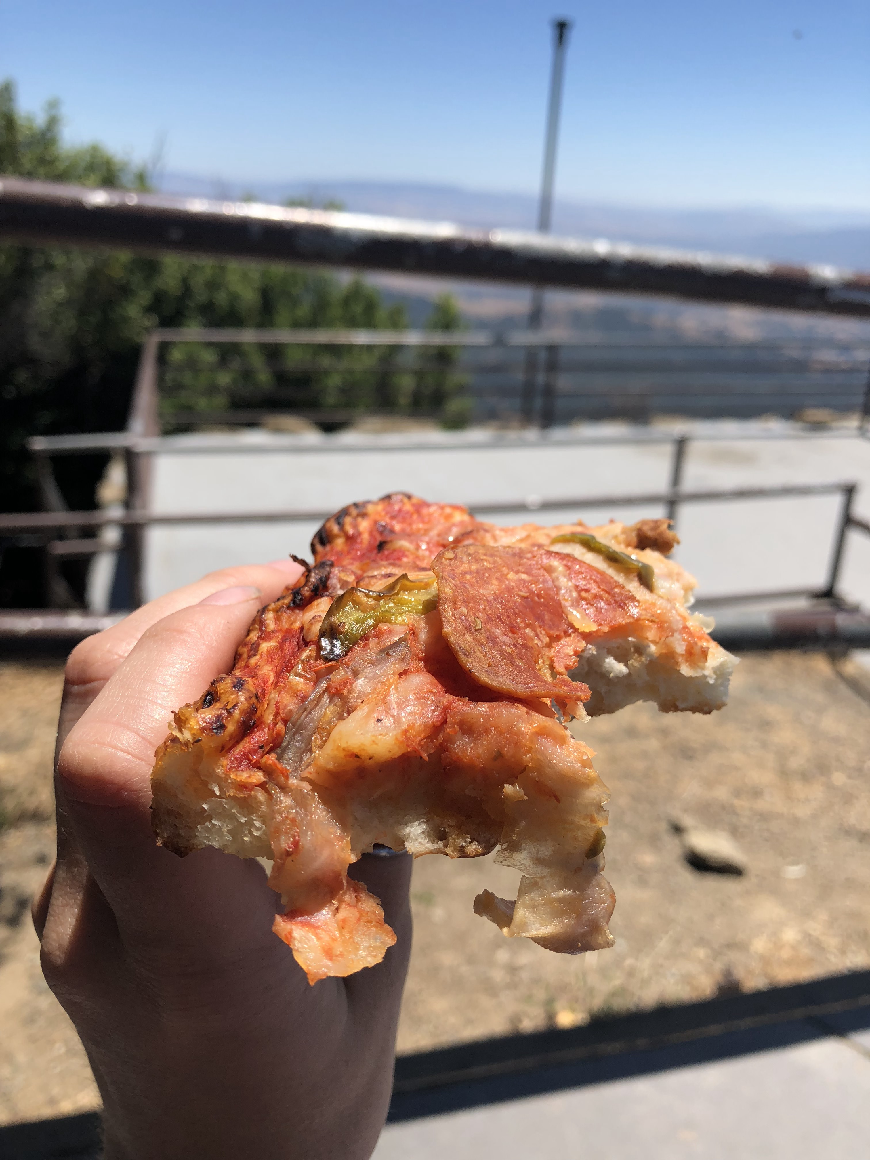 Eventually, I made my way up to the pavement part of the trail and found the summit sign, which is still a ways down from the actual summit, which has a building with a big viewing platform. This, like the Umunhum and Mt. Tam summits, is a summit that is drivable (which does take away a little bit from the elation of summiting, I have to admit) and there were many people up at the top, enjoying the views. I took in the views at the top, refilled my water bottles, ate an energy bar, and then pulled out the real prize, a slice of pizza that I had packed! Yum!Â